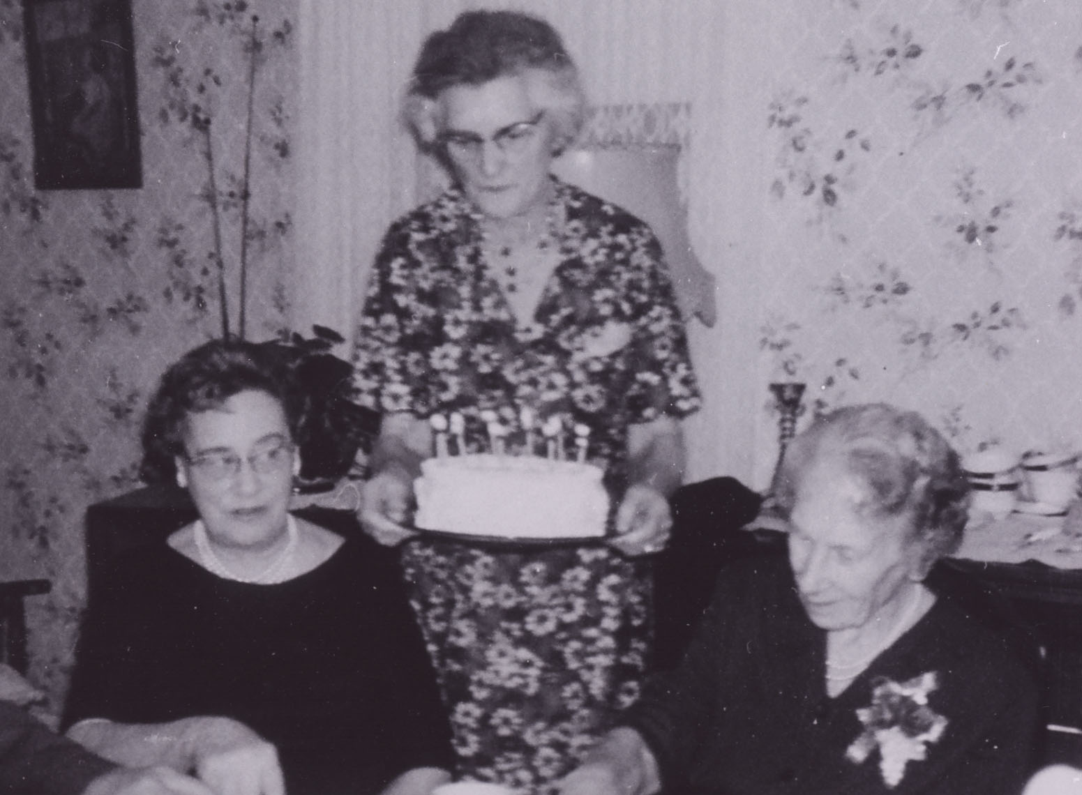 Photo of Mrs. Margaret "Mayme" Elizabeth Black on the right with two other unidentified women in 1965. Mayme was born in 1885, married Oswald R. Black in 1919, and died in 1966. Both her maiden and married surnames were Black as her husband was a relation from a different branch of the Black pioneering family of Innisfil. Mayme was the daughter of James Black and Mary Lennox, granddaughter of Robert Black and Margaret Booth, and great-granddaughter of James Black and Mary Latimer, who emigrated to Innisfil from Dungannon Ireland in 1847. In this photo she is seated at a table and wearing a corsage while the woman in the centre wearing a floral dress is holding what appears to be a birthday cake with lit candles. The picture was taken inside an unnamed home, with floral patterned wallpaper visible in the background.