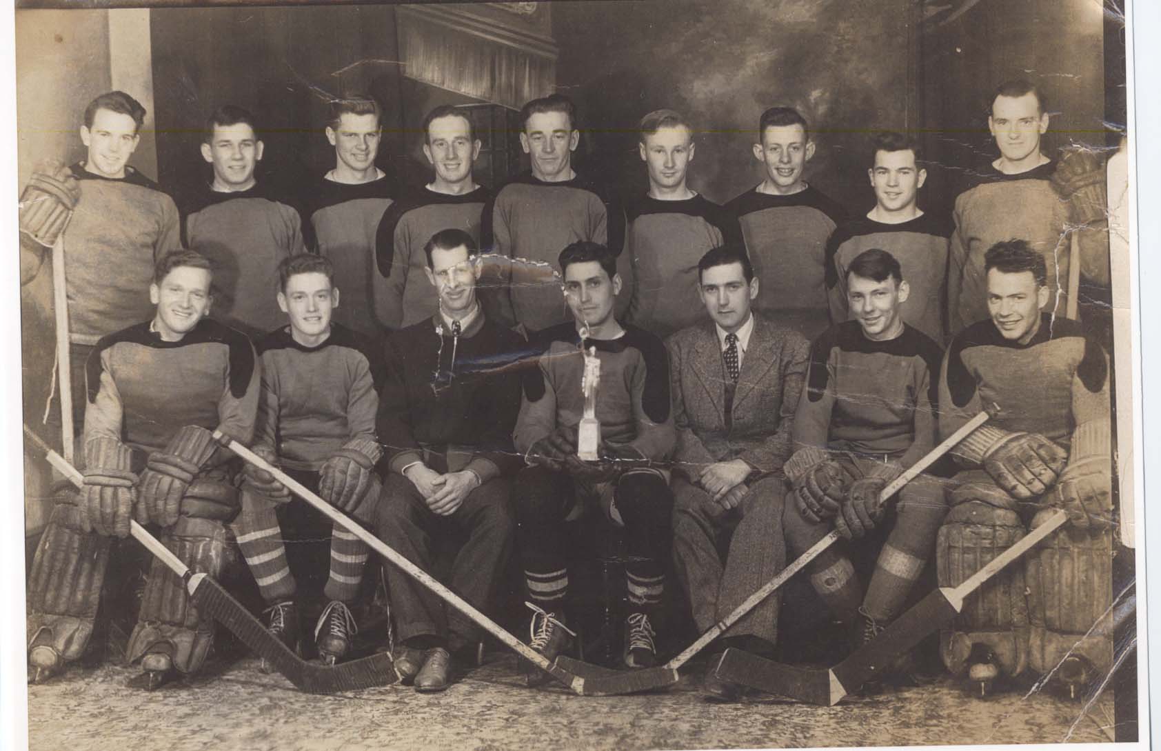 Stroud Hockey Team: Back Row: George Young, Bill Boychoff, Gordon Todd, Sheldon Bowman, Maurice Warnica, Frank Todd, Allan Lennox, Doug Fralick, Elwood Webb. Front Row: John Bowman, Austin Bowman, Art Tiffin, Albert(Abby) Reynolds, Ralph Robertson, Ray Webb, Jim Wilson. Further information is available at the Knock Heritage Site