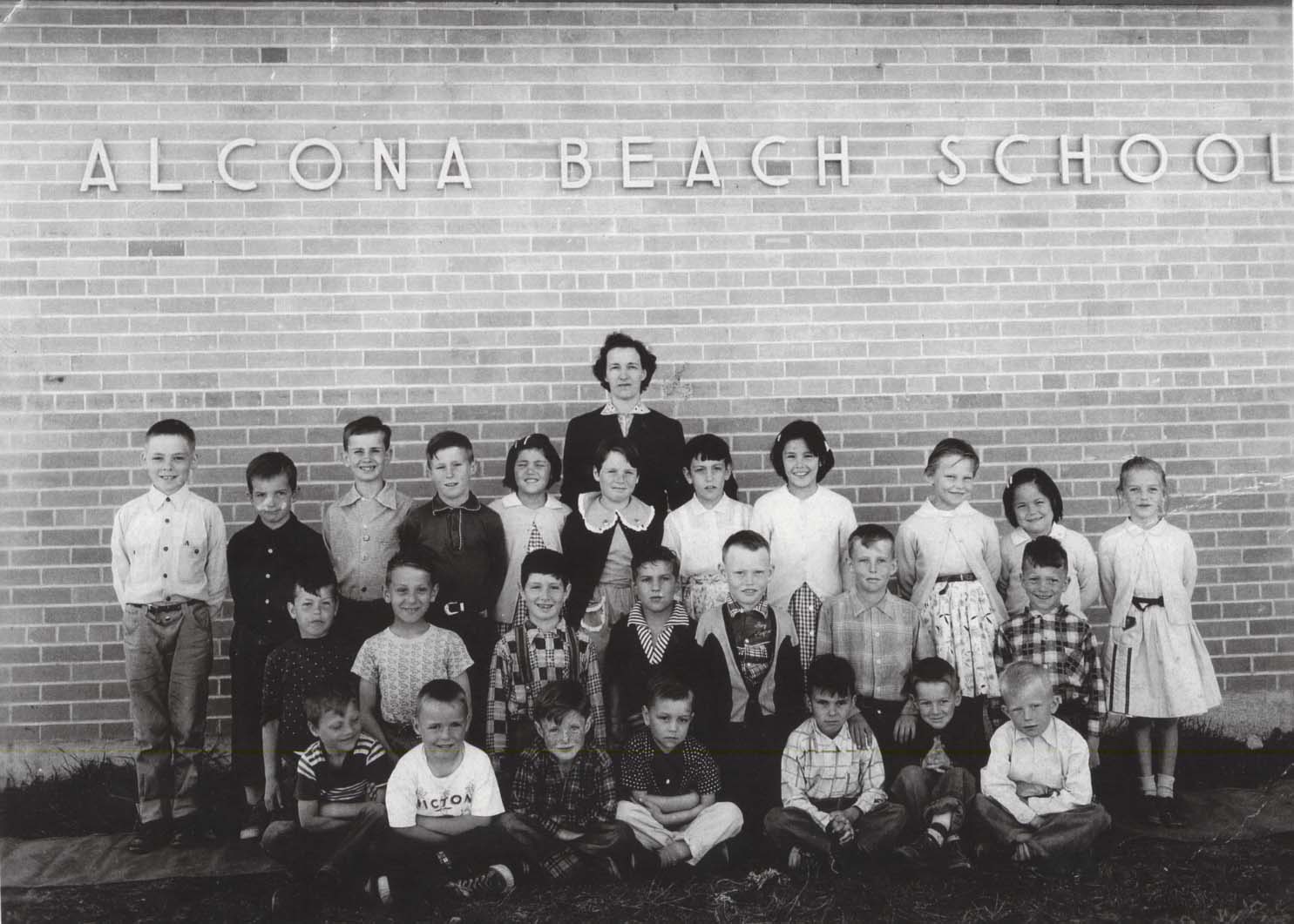 Alcona Beach Public School Junior Room class photo, 1955-56, with teacher Gladys Fralick. Pictured from left to right: Back Row: John Wiggins, Victor Shepherd, Stephen Stephenson, Brian Lang, Lillian Sakata, Darryl Ruffett, Heather Henderson, Joanne Sakata, Joanne Little, Marie Sakata, and Betty Lou Coughlin. Middle Row: Wesley Lawson, Leo Paquette, Wynne Andrade, Billy Little, John Steenholdt, Billy Guerin, and Roger Leblanc. Seated: Peter Godmire, Charles Richard, Jackie Maxwell, Ricky MacLellan, Paul Hobeck, David Fralick, and Donnie Guerin.