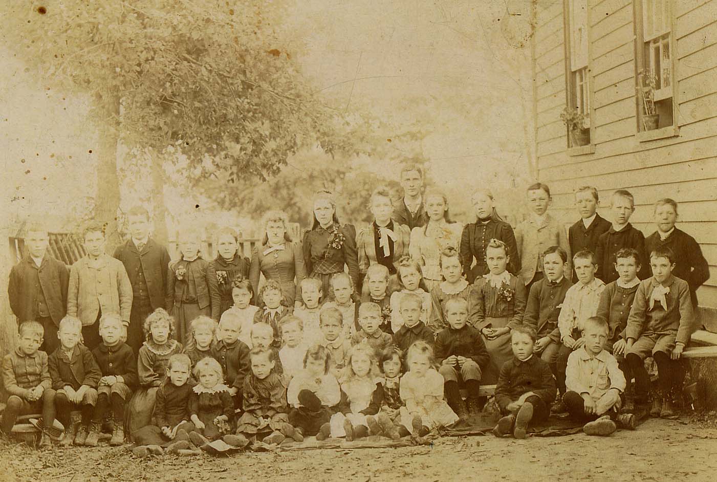 Image of the 5th Line School, located in Tyrone. The image shows the students posed outside of the school in smart clothing. The students are unknown except for Gertrude Reid (later Mrs. Ledgerwood of Taber, Alberta) sixth child from the left in the front row, and Florence Reed (later Mrs. David H. Ross of Cookstown) seventh child from the left in the front row.