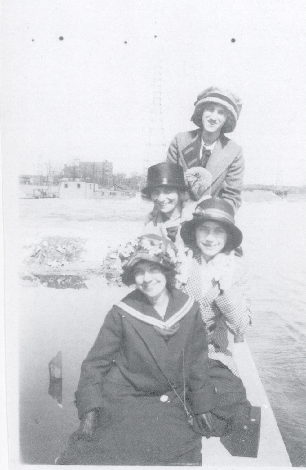 Photo of Connie Wisker and three friends on a dock in Lake Simcoe, with the Lake Simcoe Ice House visible in the background. The four young ladies are all dressed in long dresses and coats, and are wearing short brimmed hats.