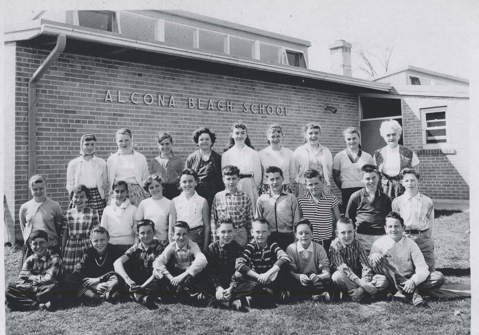 Alcona Beach Public School class photo of grades 5 to 8, 1959-60, with teacher Mrs. Doris Booth. Pictured from left to right - Back Row: Maureen Stewart, Carol Jones, Kate Andrade, Sharon Rockcliffe, Diane Barthorpe, Nancy Ford, Elizabeth Fogal, Noreen Kennedy, and Doris Booth [teacher]. Middle Row: Lynn Davis, Frances Shepherd, Rachel Paquette, Eleanor Shepherd, Sandra Campbell, Fred James, Jim Wilson, Alan Gillespie, Bob Stewart, and Jeffrey Spillman. Front Row: Wynne Andrade, Glen Mason, Victor Shepherd, Steven Stephenson, John Wiggins, John Steenholdt, Raymond Gillespie, Andrew Wilson, and Harold Shepherd.