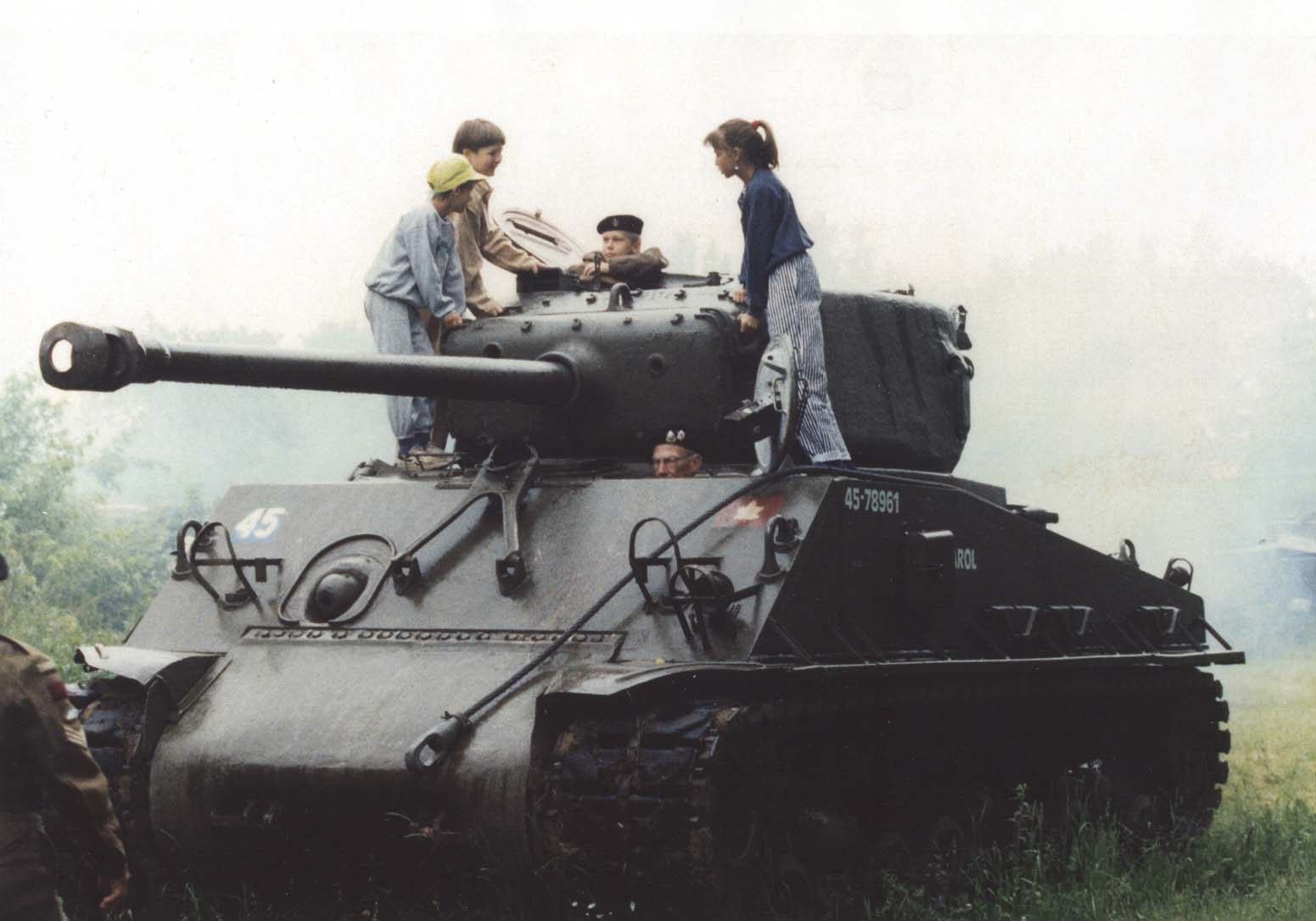 Stacey and Scott Goheen climb on board the restored Sherman tank while their grandfather, veteran of WWII, Ernie Goheen looks out the opening.