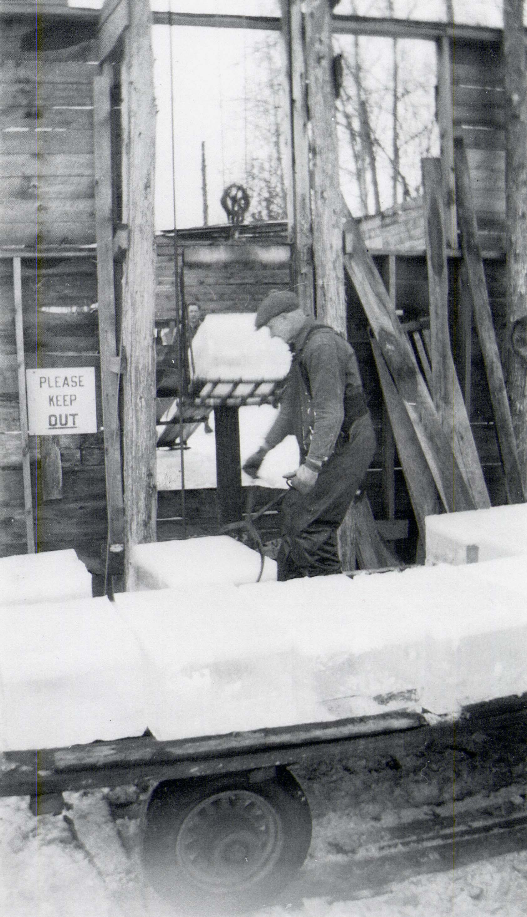 Black and white image taken in 1949 during an ice harvest. Alex Black can be seen unloading blocks of ice, from Lake Simcoe, off a conveyor. The image was taken at Cliff Carscadden's ice house, located on Hastings Avenue.