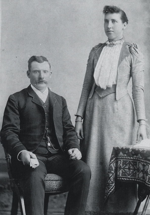 The wedding photograph of David Peacock and Addie Brown who later became owners of the Painswick General Store. Addie Brown was born on the 5th Concession of Flos and came to Dalston with her parents and family to farm. David Peacock was born in Scotland and came to Canada with his parents as a child. They were married in Dalston. In the photo, David is seated and dressed in a dark suit with pinstripe pants while Addie stands to his left wearing a long light coloured dress with a long sleeved jacket and a white ruffled blouse.
