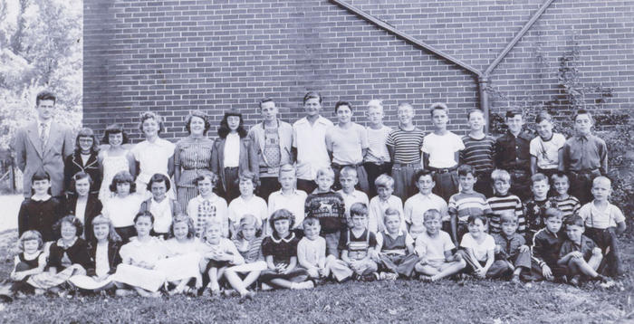 Bell Ewart Public School 1951 Teacher Harold Smith Grades 1-8 Back row: H. Smith, Louise Sheldon, Dixie Johnson, Elizabeth Reid, Shirley Curtis, Neva Archer, Brod Johnson, Victor Posius, John Atkinson, Norm Young, John Curtis, Ron Tuckey, Wilson Forbes, Harold Hill, Alvin Reid, Doug Heath Middle Row: Paula Astill, Lynn Rowat, Gail Banks, ----, Yvonne Walton, Grace Forbes, Ian Johnston, Doug Young, John Hadley, Kerwin Robbins, Ian Atkinson, Peter Astill, Doug Robbins, --Royce, -----, Gerald Hadley Front Row: -----, Geraldine Miller, Judy Moffatt, Mary Astill, Ellen Matteer, Geraldine Hadley, Doreen Peacock, Marilyn Ferrier, John Miller, John Forbes, Bill Trombley, Gordon Young, ----, ----, Malcolm McDowell, ------ Schools - Bell Ewart Bell Ewart