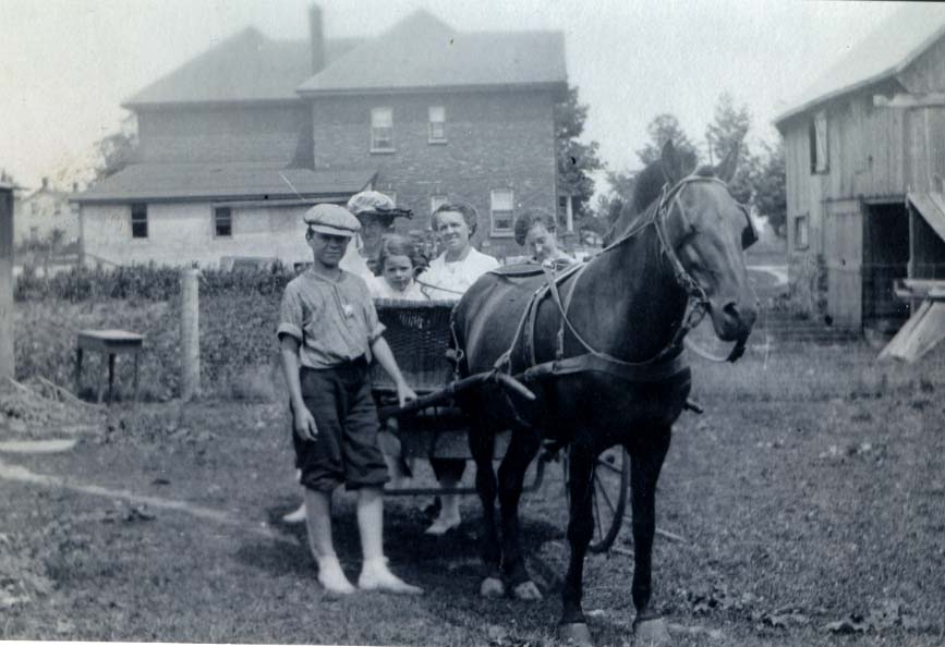 Outdoor photo of Mrs. Hannah Jobbitt (married to Fred Jobbitt) sitting in a horse-drawn cart with her son Earl wearing a flat cap standing to the left of the horse. The names of the others in the cart, two ladies and one young girl, are unknown. The photo was taken a farmyard beside a barn with a house visible in the background.