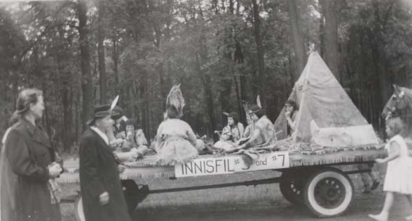 Photograph of the float designed by Cherry Creek S.S. #3 and Fifth Line S.S. #7 for the parade celebrating the Township of Innisfil's Centennial year, June 1951. The parade was held in Innisfil Beach Park. The float contains a number of school-aged children in Native clothing with a small tipi structure at the rear.