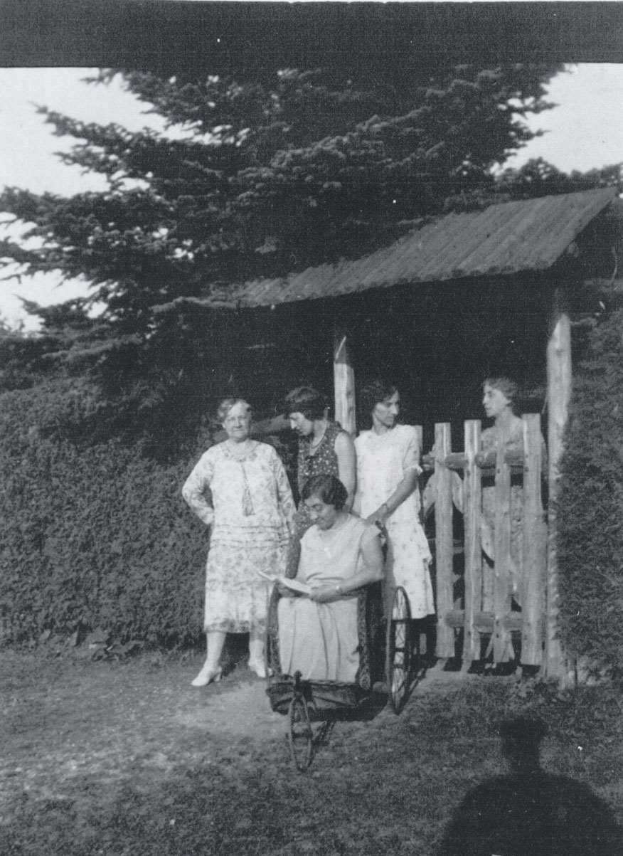 Group photo of five women. Three women are standing in front of a wooden gate and behind a woman in a wheelchair who appears to be reading book. The fifth woman stands behind the closed gate. There is a shadow of another person visible in the foreground. Ethel Wisker is in the wheelchair in front, she was injured as a young girl in a skating accident. The woman on the left is Margaret Wisker. One of the women behind the wheelchair is Connie Wisker, the other woman is not yet identified. Miss Forbes stands behind the gate.
