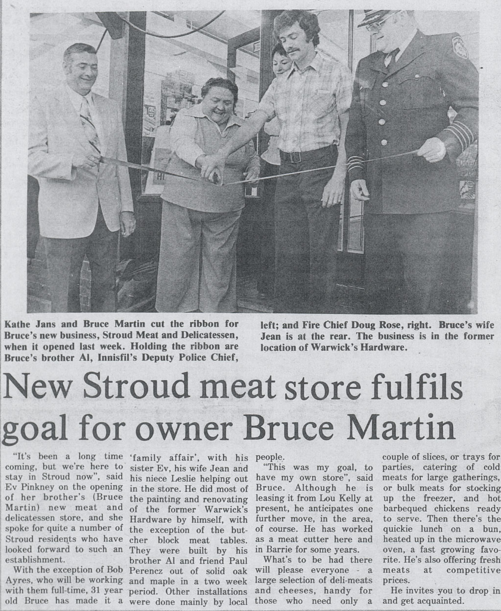 Ribbon Cutting Ceremony of Stroud Meat and Delicatessen Allan Martin,Deputy Police Chief, Kathe Jans, Councillor, Jean Martin, Bruce Martin, owners and Doug Rose, Fire Chief