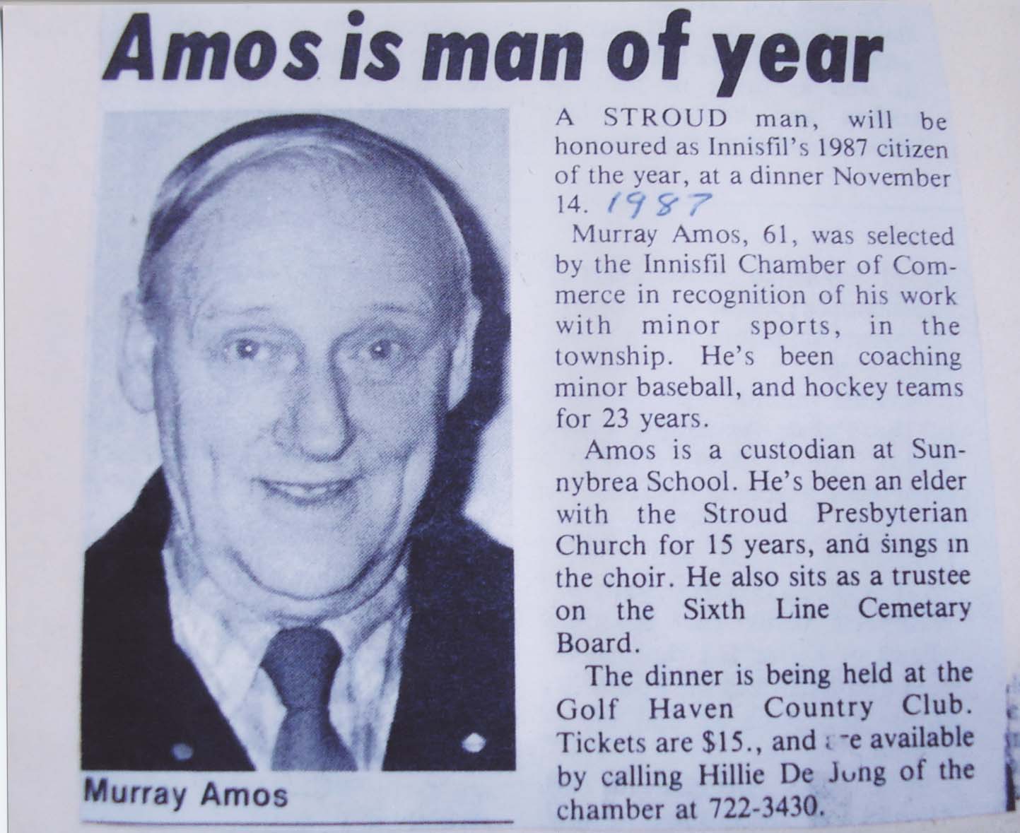 Golf Haven Country Club, Gilford. 1987 Citizen of the Year Recipient was Murray Amos, of Stroud. This honour was bestowed on Murray who was selected by the Innisfil Chamber of Commerce in recognition of his coaching minor baseball and hockey. This is a newspaper clipping from the Innisfil Scope. Award - Citizen of the Year 1987 Amos, Murray