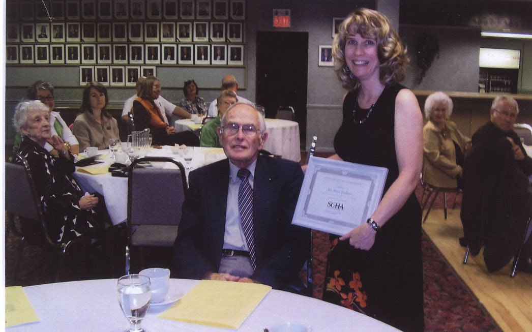 Long time Innisfil Historian Ross Wallace is presented with a lifetime membership to the Simcoe County Historical Association by Jill Hynes, in honour of his long and valued commitment to this organization.