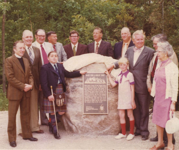 Unveiling of the historic plaque "Mast for a Great Ship". Left to right: Rev.---, ---, Don Beatty, Hugh Jackson, Hilton Webb, George Burton Reeve of Innisfil, Blake Constable, Councillor Art Evans, M.P.P. Harold Webb, Erma Webb Hobley (sister of Harold Webb). Front row: Ross Channen, Curator Simcoe County Museum, Judy Webb.