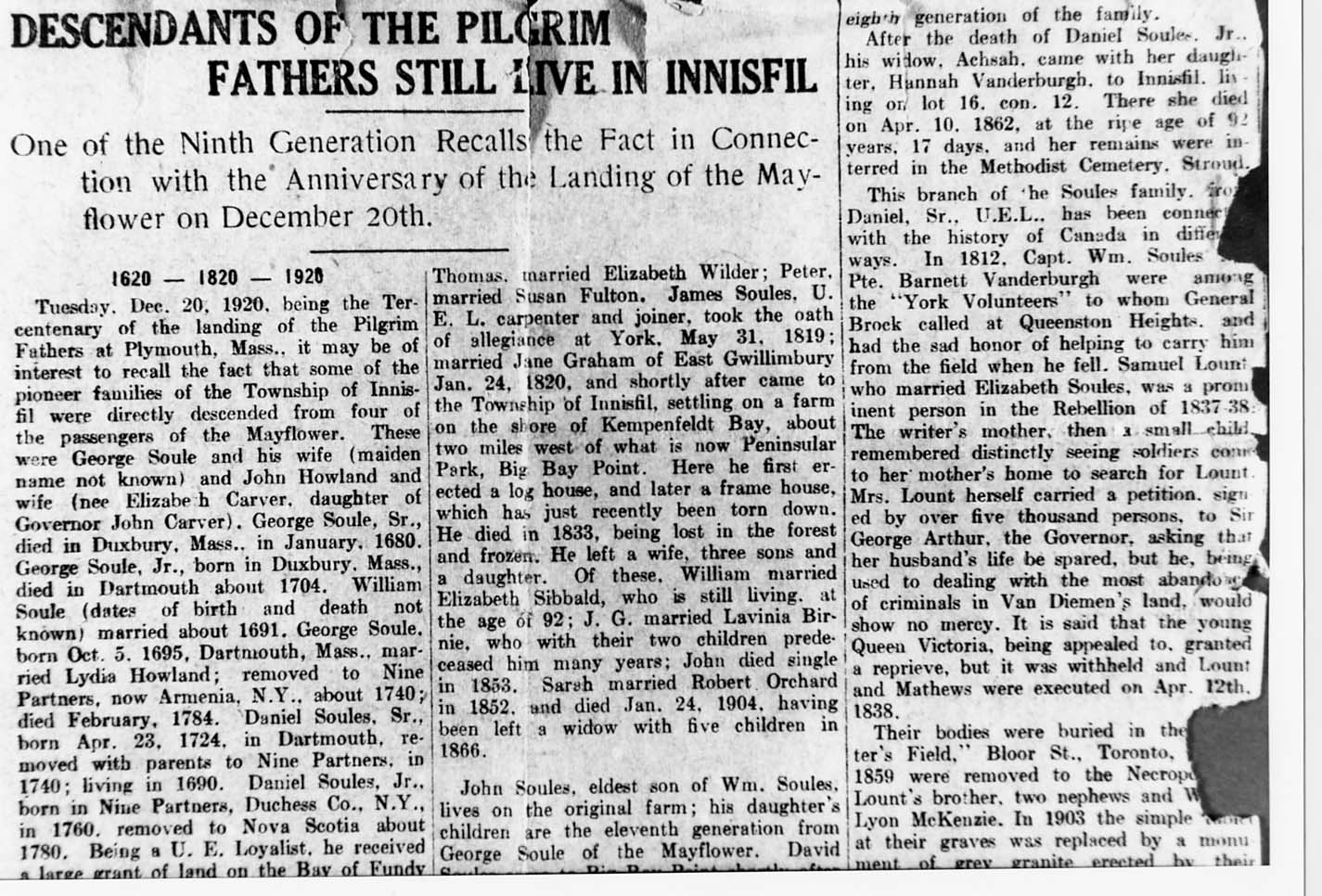 Clipping from the Barrie Examiner- the history of the Soules Family who settled at Big Bay Point in 1822. The second family to settle in Innisfil. "Descendants of the Pilgrim Fathers Still Live in Innisfil."