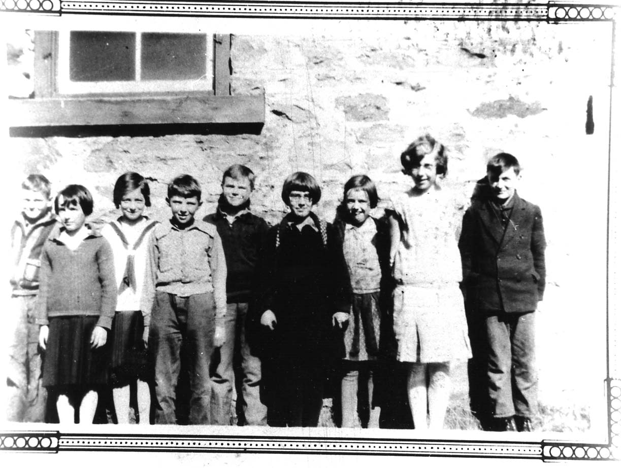Group photo of students standing in a row in front of Nantyr School on the 7th Line in 1930. Pictured from left to right are: Everett Cameron, Gladys Spring, Jean Ralston, Clarence Ferguson, Doug Robinson, Jean Duncan, Evelyn Emrick, Helen Spring, and Billy Kelly.