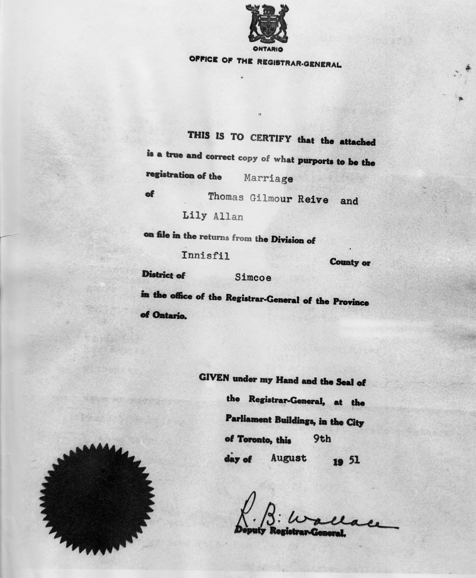 Marriage Registration of Thomas Gilmour Reive and Lily Allan Social Events Wedding