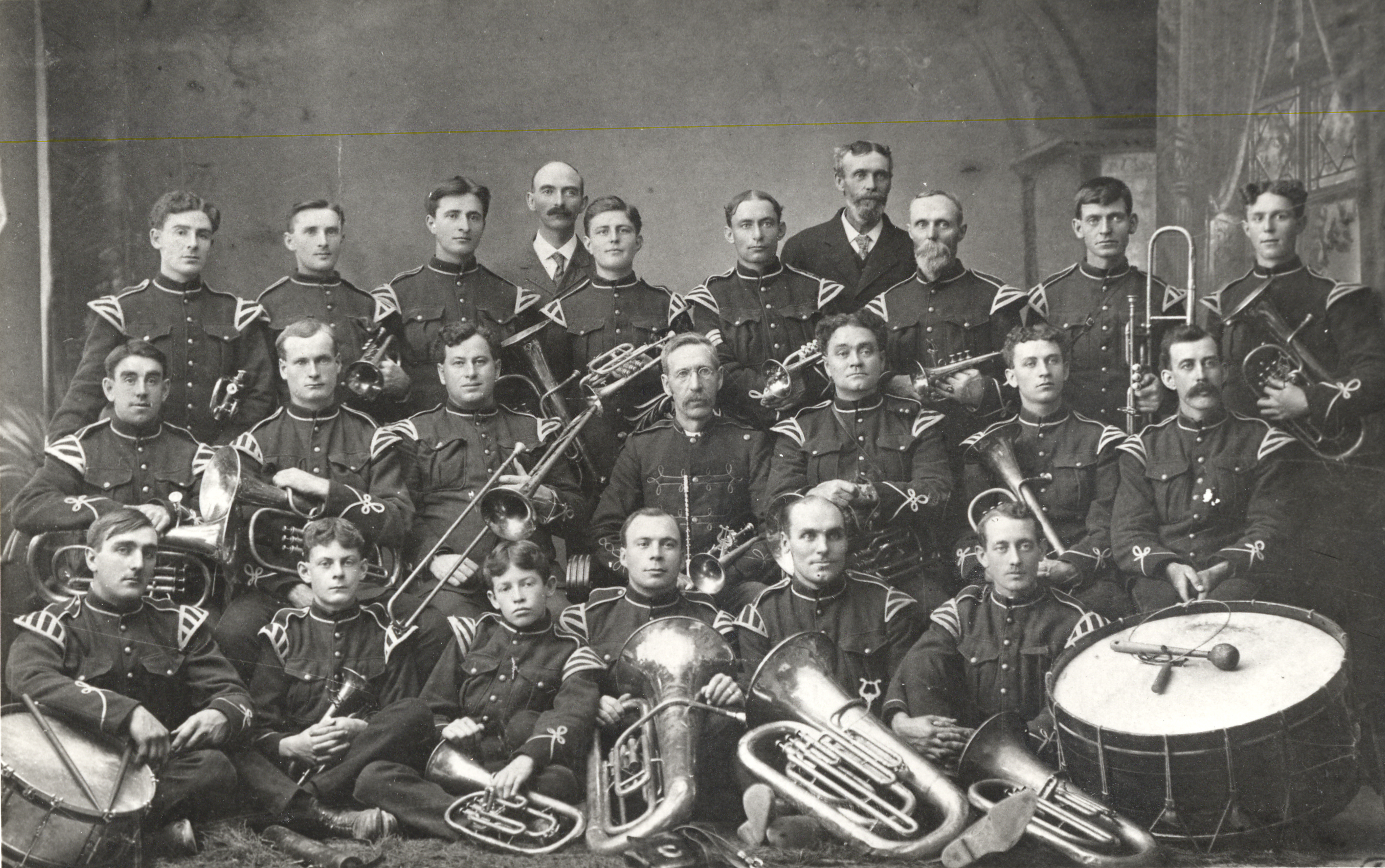 35th Regimental Band - Thornton 1908. Officers: Honorary President J.A. Corbett, President Fred Tomlinson, lst Vice-President Alex Stewart, 2nd Vice President A.E. Ayerst, Musical Director Robert Lennox, Secretary J.A. Stewart, Treasurer Harcourt Blackstock Top row from left: F. Tomlinson, A. Stewart, 2nd row: F. Nixon, W.T. Hill, M.H. Corbett, M.L.R. Stewart, S.J. Maiel, J.A. Stewart, J.F. Ayerst, J.M. Speers, 3rd row: R. Livingston, H. Ayerst, W.B.N. Banting, Robert Lennox, W.J. Coburn, H. Blackstock, R.D. Henry. Bottom Row: A.W. Fletcher, T.W. Ayerst, R.S. Blackstock, B. Smith, C.H. Fisher, H. G. Arnold Uniforms Music - Bands