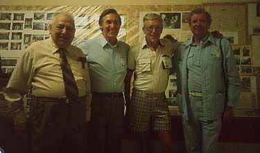 Photo of four men standing side-by-side posed in front of a picture display at the Cookstown reunion in 1984. Pictured from left to right are: Clifford Spindloe, Jo. Davis, Tibb Miller, and Stewart Cooke.