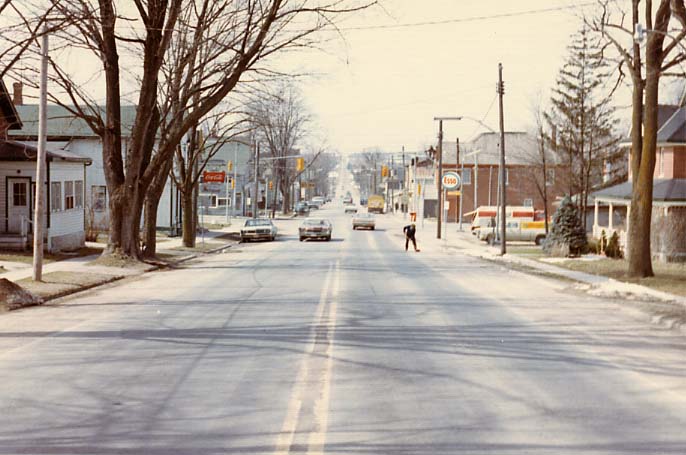 Photo taken on Church Street looking west towards Queens Street in Cookstown, likely in the 1970s. The Esso gas station is visible in the centre right, with several cars on the road. The trees are leafless indicating that the photo was taken in the early spring or late fall.