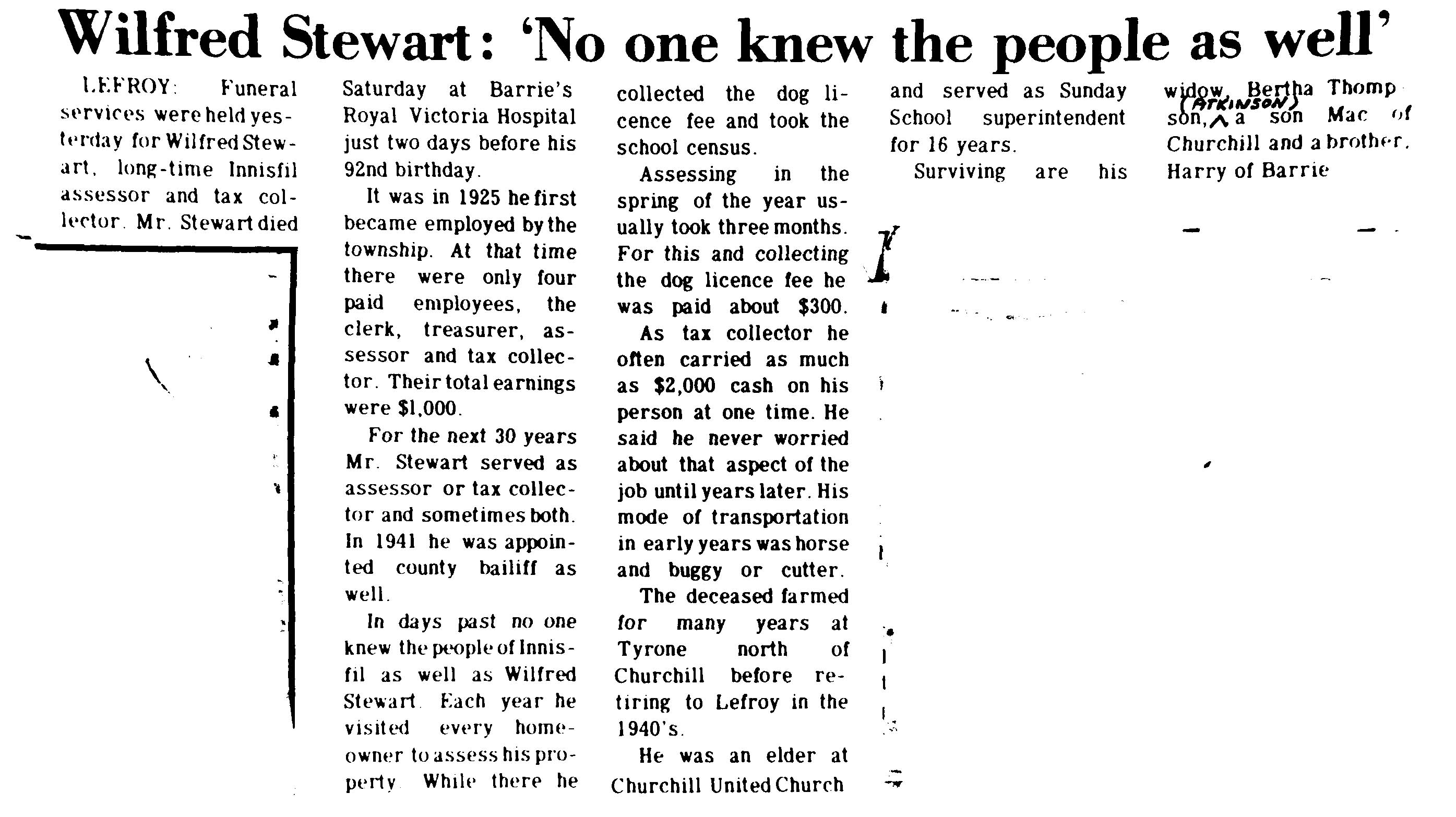 Mr. Wilfred Stewart, Lefroy -newpaper clipping, (Mrs. Bertha Stewart's second husband). 1882-1974