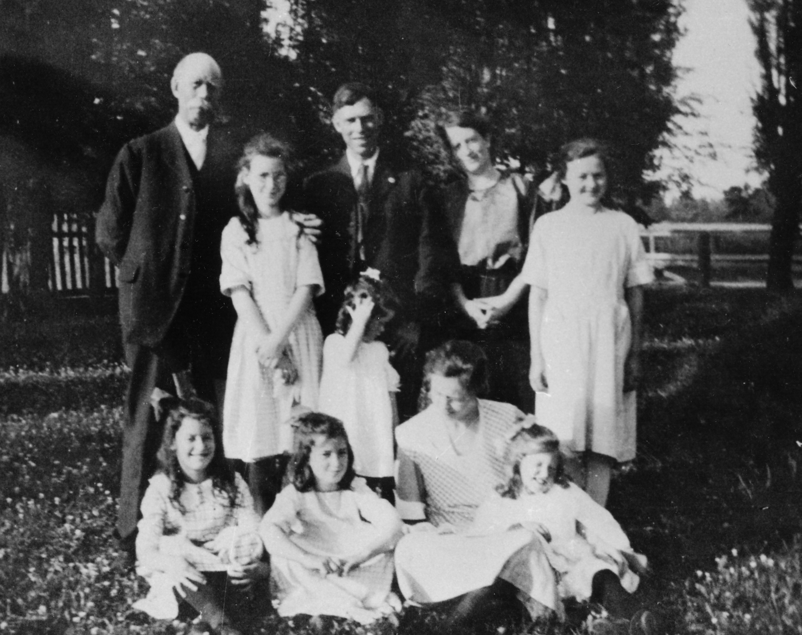 Back row left to right: William P. Carr, Marion Carr (Mrs. Cecil Harris), Selby Carr, Ada Carr (wife of Selby), Emily Bowman (lived at Robert Carr's), child standing is Margaret Carr (Mrs. Sidney Oliver) Front row: Isabel Carr (Mrs. Tom Bowman), Wilda Carr (Mrs. J.R. Johnston), Joyce Carr (Mrs. Wm. Warnica), Enid Carr (Mrs. John Springer).