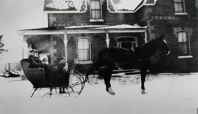 Image taken in 1922 of Howard Allan in a sleigh with his children Ronald and Grace. The sleigh is being pulled by a horse in front of their family home. The house is located on the fourth line of Innisfil, west of Churchill - Lot 14, Concession 3.