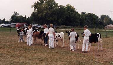 Image taken at the 1990 Cookstown Fair with six young children, all dressed in white, with their calves preparing to enter a competition. The children are no more than 10 years old and except for one brown calf, the calves are all black and white. The child on the far right is Max Lupo, and the calf next to him is name Dorris.
