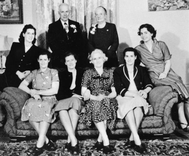Back row left to right: Margaret Carr (Mrs. S. Oliver), Selby Carr, Ada Carr (wife) Front row: Isabel Carr (Mrs. Tom Bowman), Enid (Mrs. John Springer), Marion (Mrs. C. Harris), Wilda (Mrs. J. Johnston), Joan (Mrs. Ralph Robertson).