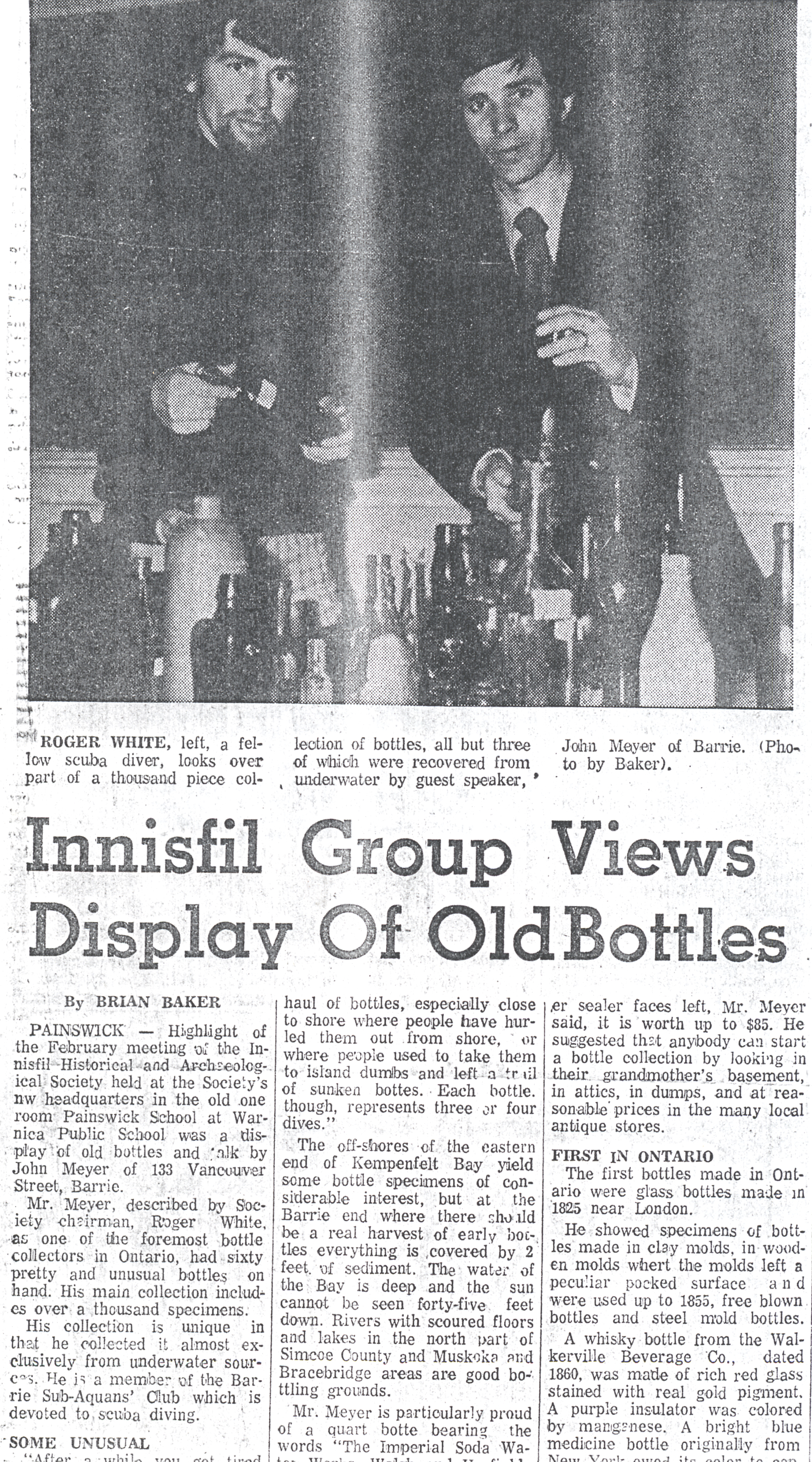 Copy of a newspaper clipping from the Barrie Examiner in 1974 entitled: "Innisfil Group Views Display of Old Bottles." Written by Brian Baker the article outlines a presentation made by John Meyer, a Barrie scuba diver and bottle collector, to the Innisfil Historical Society to discuss his collection of antique bottles recovered from Lake Simcoe. For his collection of more than a thousand bottles, it is noted that each bottle represents at least two or three dive attempts. The bottom of the article is unfortunately missing, but it does include a photo of Mr. Meyer (right) with Roger White, a fellow scuba diver, standing behind a portion of the bottle collection.