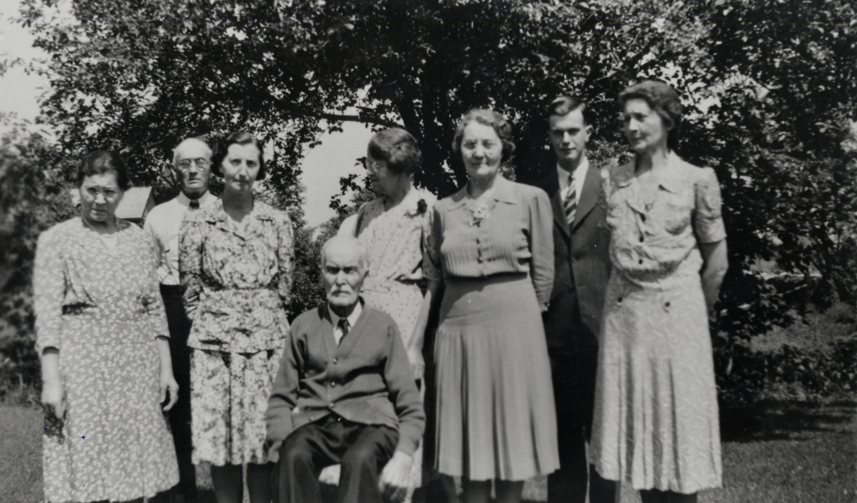 Family of George Webb and Mary Ann Mathers: (l to r): Zelma Webb 1886-1974 (Mrs. George Neely);George Neely; Mildred Webb 1897- (Mrs. Walker McFarland; Gertrude Webb 1882-1970's (Mrs. Herb Fennell); Amy Webb 1884-1970 (Mrs. Edgar Kerr), Camrose Alberta; Francis McFarland 1928- (son of Mildred); Reta Webb 1890-1958 (Mrs. Bert McConkey); George W. Webb (sitting) (born August 24, 1856 - died July 26, 1944) husband of Mary Ann Mathers 1856-1906
