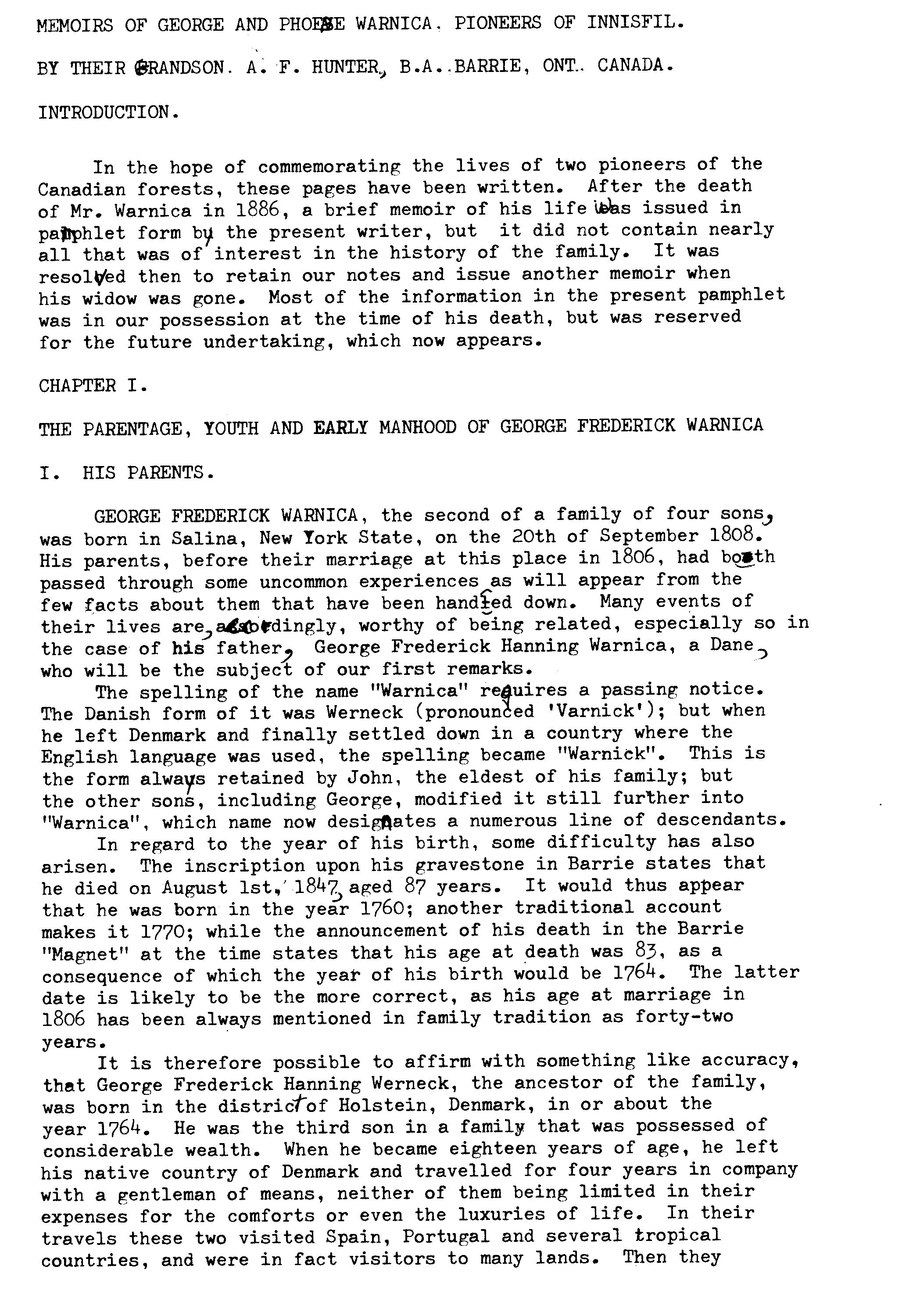 Typewritten transcription of booklet "Memoir's of George and Phoebe Warnica: by A.F. Hunter, 1891. Typed from a photocopy of the booklet. Also photocopy of original. See also #3544, another Warnica memoir by A.F. Hunter. Further information is available at the Knock Heritage Site