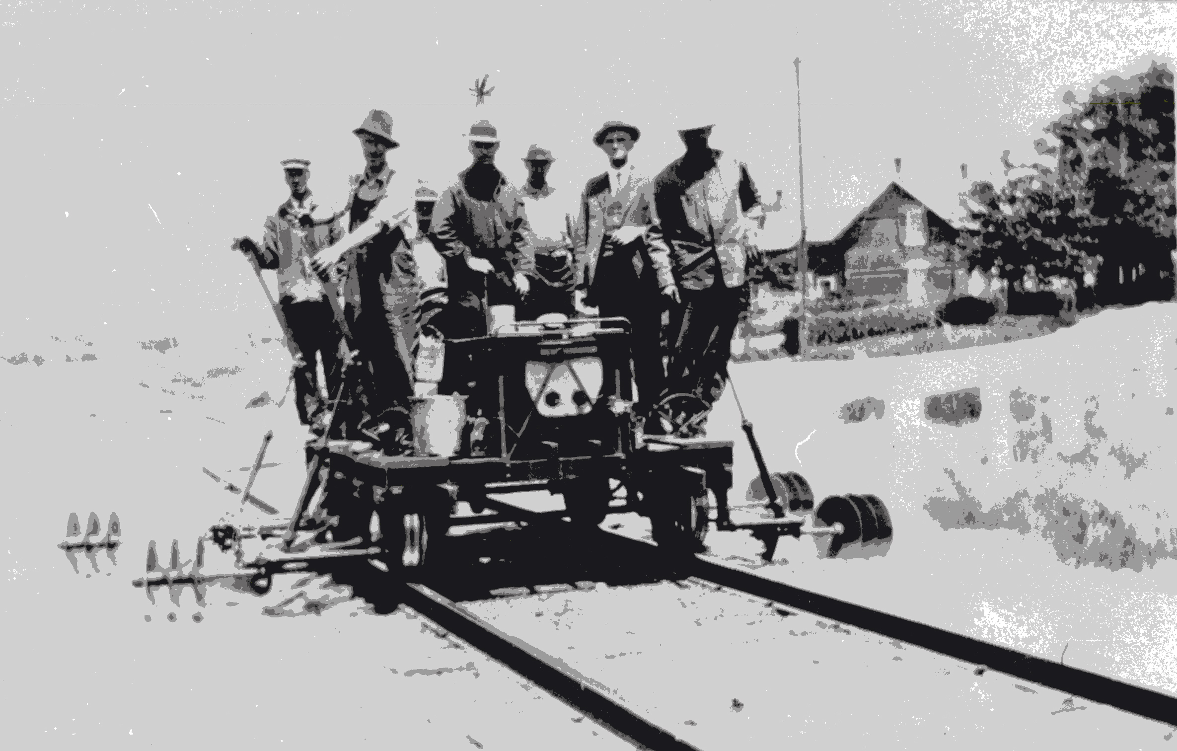 Photo of a number of men standing on a handcar for the Canadian National Railway (CNR, later CN). Pictured in the centre is Sam Maiel, who was a section foreman for many years on the railroad between Georgetown and Barrie. Pictured second from the right is Ed Gray.