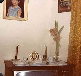 Image taken in 1979 of some of the Baker family collectibles. Alice Baker set out some of the original set of dishes she had when she and Norman were married. In 1981, the dishes of Cloverleaf pattern are collectibles. In the image there are egg cups and tea stand, dinner plate, tea plate, cup and saucer, bone handle knife, plain fork and spoon and tea pot stand.