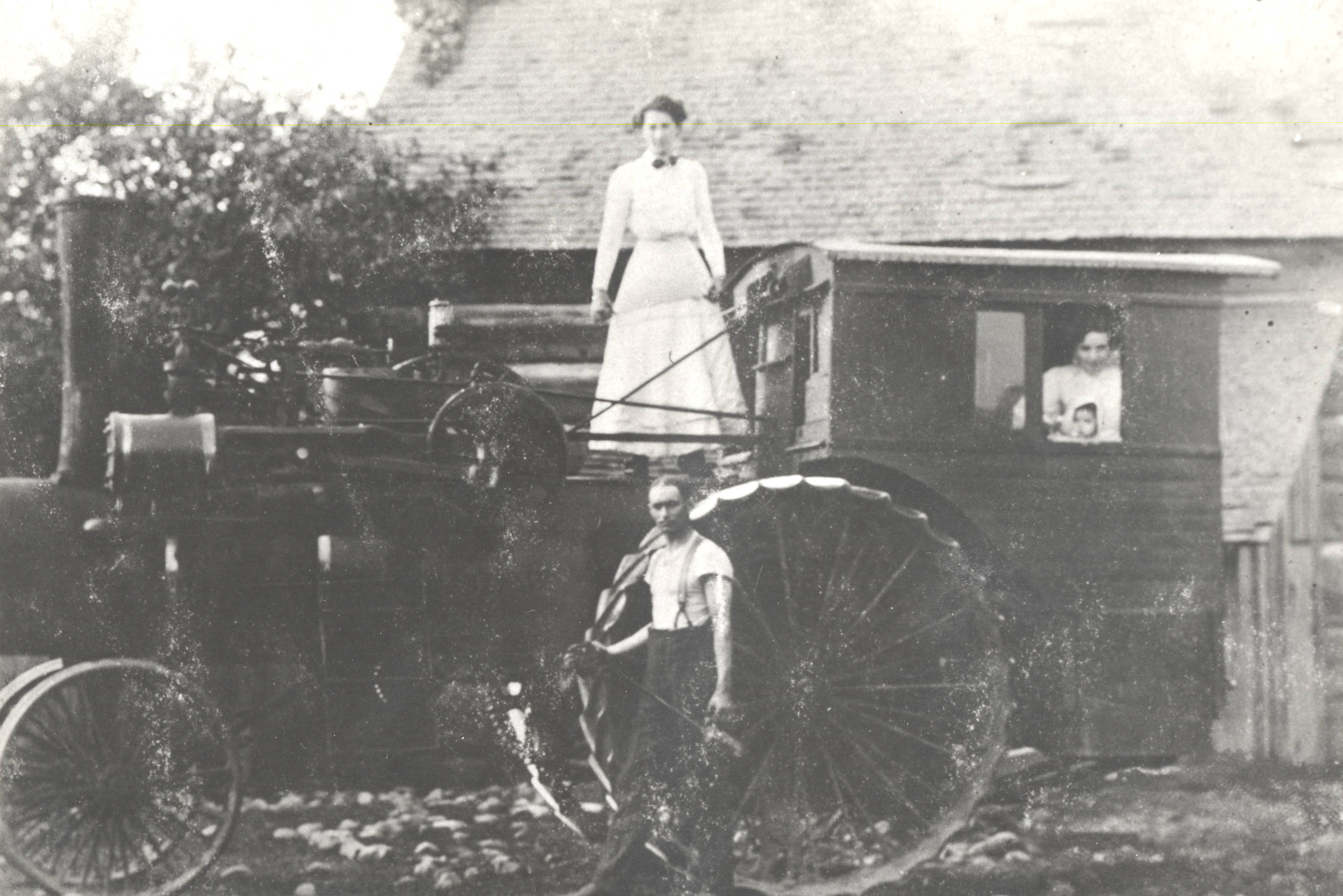 Photo of Mary Maiel (née Summers) standing in a long sleeved white dress on a steam tractor that has been modified with a cab for passengers. Inside the cab are her daughters, Dorothy and Ilene. Standing in front of the machine is Sam Maiel in short sleeves and suspenders. The tractor has steel wheels and appears to be parked in front of a farmhouse.