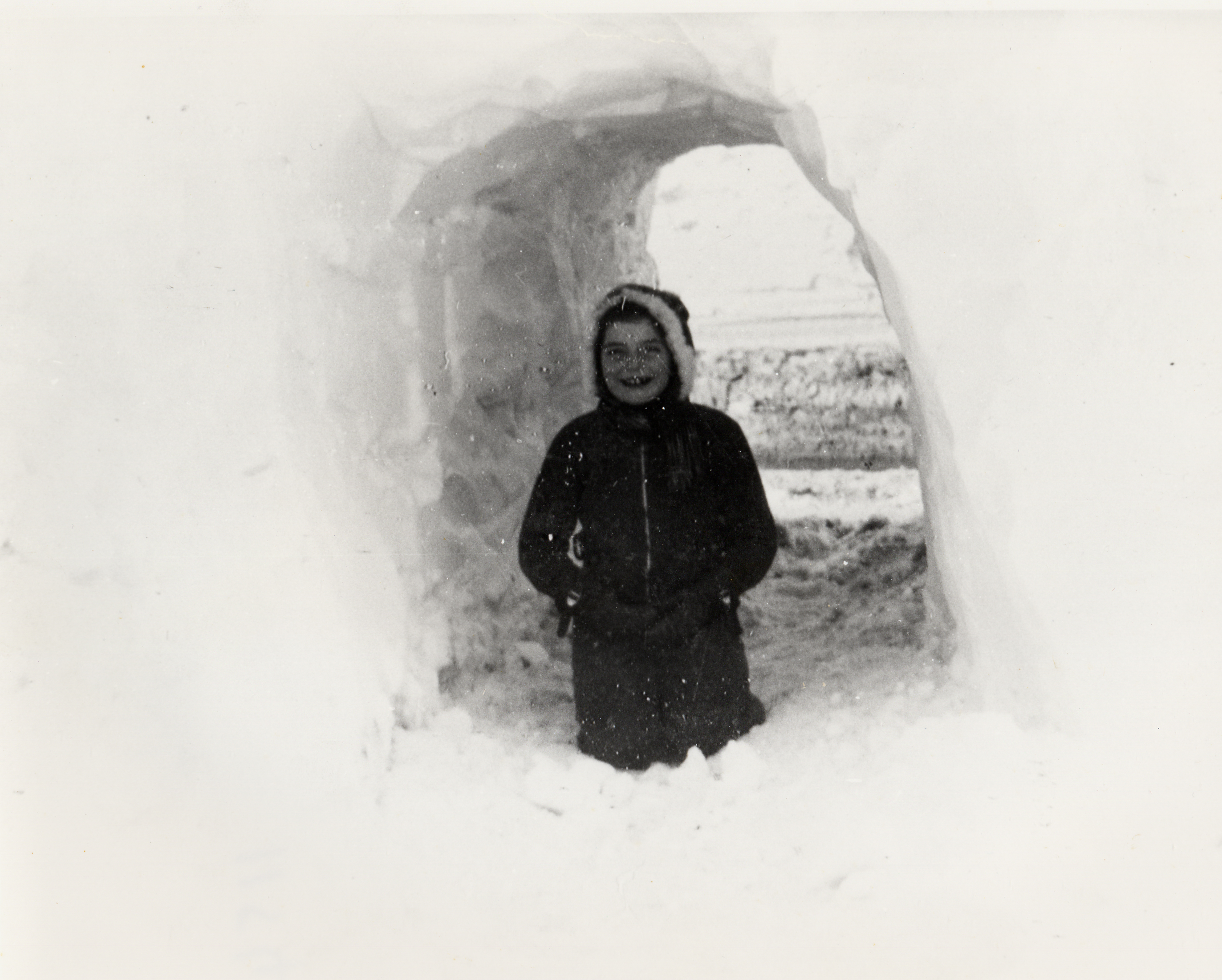 Picture of 8th Con (now Innisfil Beach Rd) and Highway #11 (now #4). Edith Thompson standing in snow tunnel through a snow drift to #11 Highway. This was one of the worst snow storms. (Note the size of the drift.) It was the only way to get to the highway.