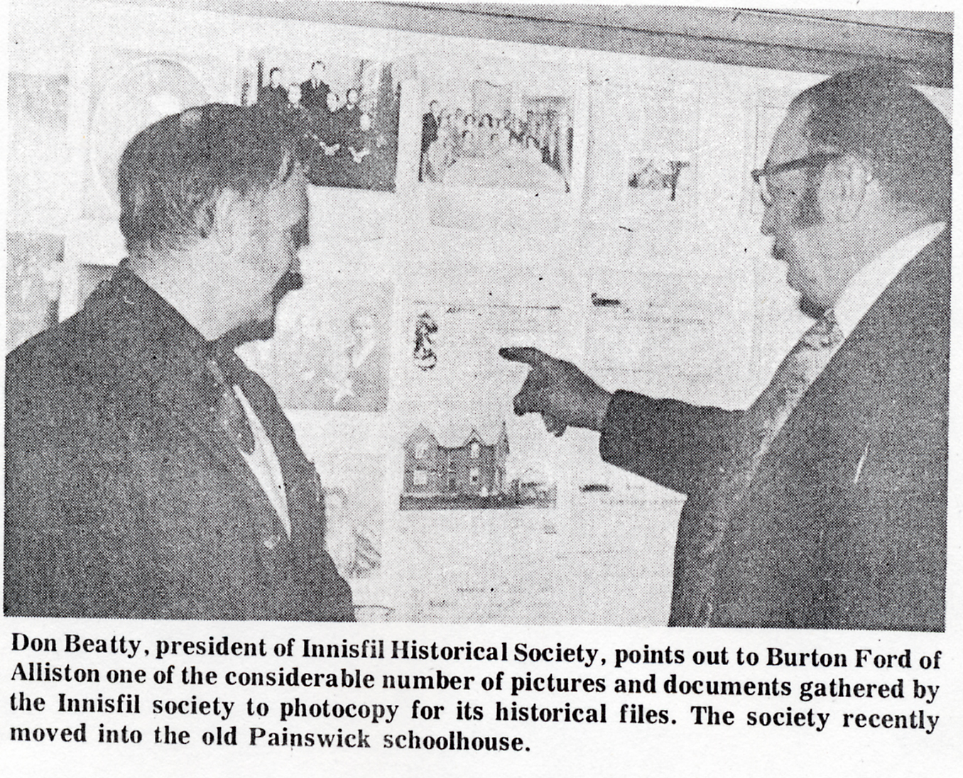 Clipping from the Barrie Banner depicting two men, Don Beatty (right) and Burton Ford (left), looking at a bulletin board full of photos. The caption reads "Don Beatty, president of the Innisfil Historical Society, points out to Burton Ford of Alliston one of the considerable number of pictures and documents gathered by the Innisfil society to photocopy for its historical files. The society recently moved into the old Painswick schoolhouse."