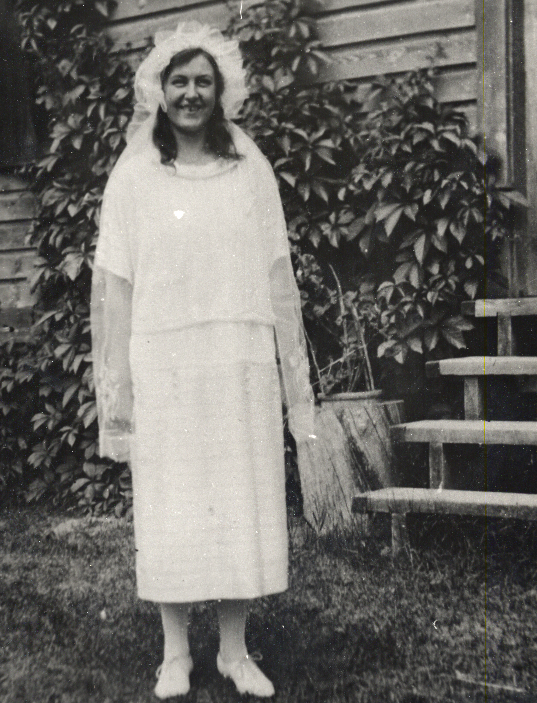 Margery Yeates in confirmation dress at St. Paul's Anglican Church, Innisfil Reverend A.D. Cousins, minister 1922-33 Churches - Anglican - St. Paul's Costumes and clothing