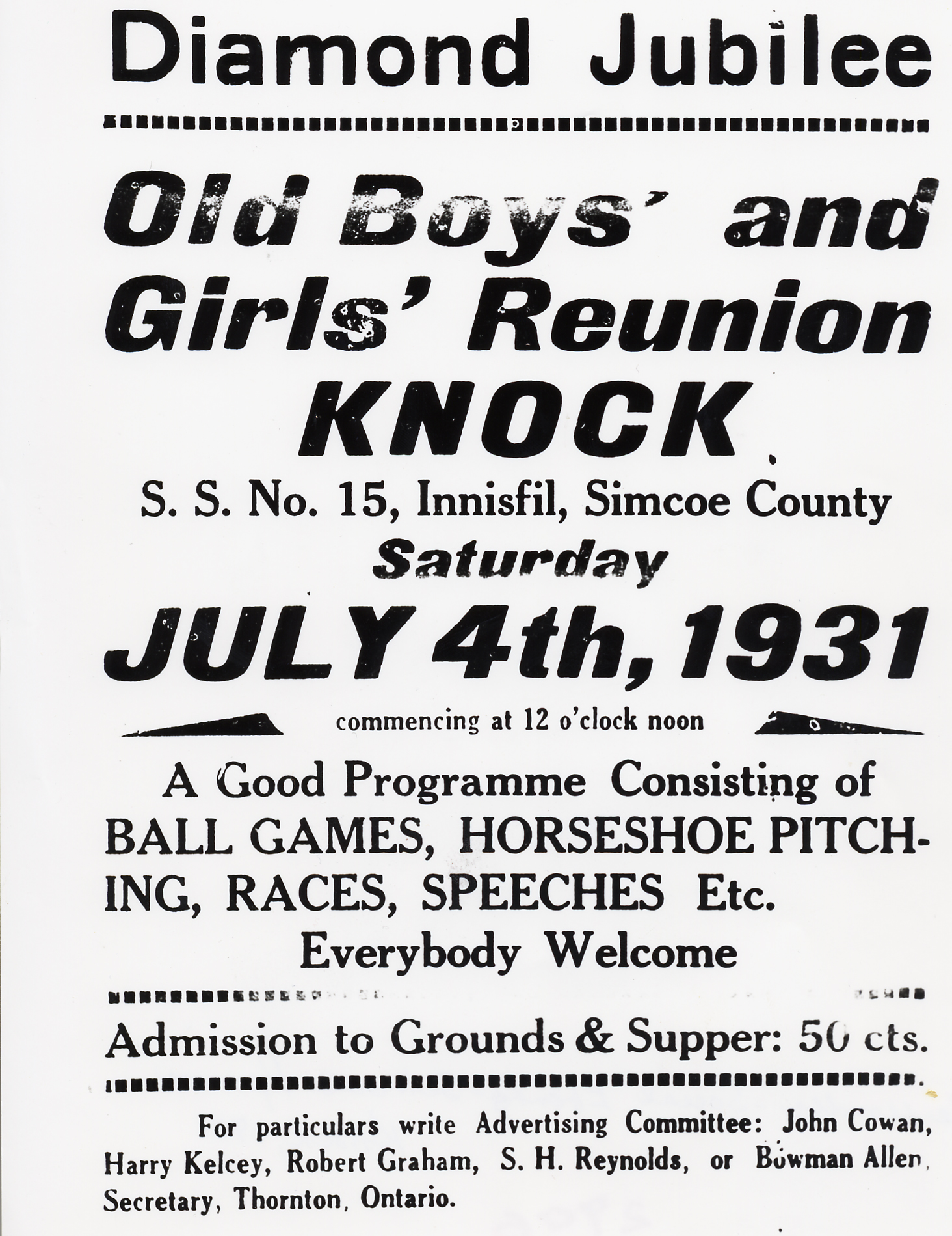 Poster/flyer advertising Diamond Jubilee "Old Boys and Girls Reunion" at Knock SS15 (Innisfil) July 4, 1931