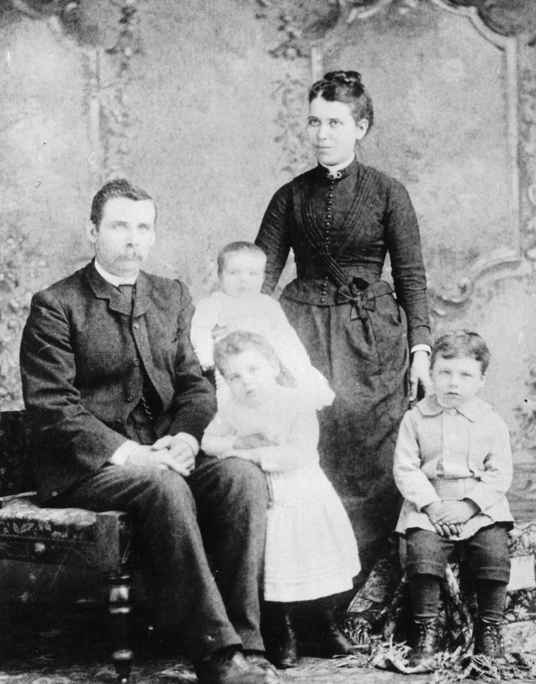 Family portrait of Robert Carr and Phoebe Carr with their children: Muriel (infant), Rebecca Jane at her father's knee, and Selby Edgar. They farmed on Concession 12, north half of Lot 18.