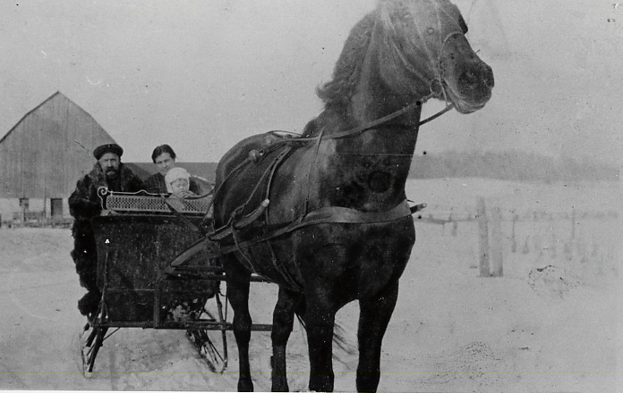 Horse drawn cutter. Alex McCullough, Florence (Beatty) McCullough and son Jack McCullough. Further information is available at the Knock Heritage Site.