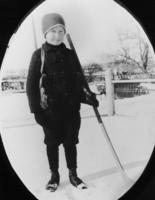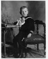 Photo of Ward Goodfellow as a toddler in a wagon being pulled by his dog. A special harness to fit the large dog's, IHS153