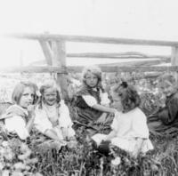 Photo of the children of Edward and Henrietta Guest (née Jobbitt) standing in front of their clapboard home in Big Bay, IHS1036