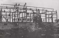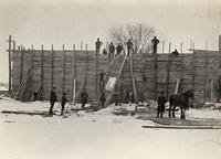 Photo showing a number of men standing on the foundation of a barn, as well as standing or sitting on the timber support
