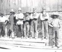 Image taken in 1910 during the barn raising at Frank Sawyer's farm. In the image, seven men can be seen wearing work, IHS1953