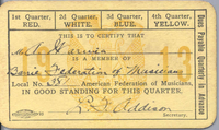 Copy of a membership card belonging to Ashford Warnica for the Barrie Federation of Musicians. The text of the card