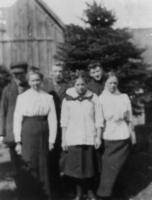 Photo of some of the MacKay family standing on the grassy field in front of Webster's Store in Belle Ewart on the corner, IHS435