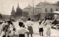 Photo of girls celebrating the arrival of a parade coming up from Toronto. Also visible is the old Sloan building on the, IHS1981
