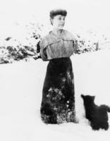 Lulu Knowles (née Quantz), sister of Fred Quantz, stands next to Fred's small hound dog, Trixie. The photograph was, IHS667