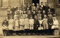 Class photo of Cookstown Public School's Second Room. The students are standing in rows on the front steps of the school,