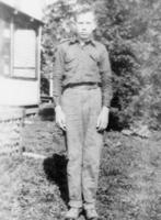 Harold Sheppard, 15 years old, standing along the old homestead waiting to go for his drivers license test, IHS684